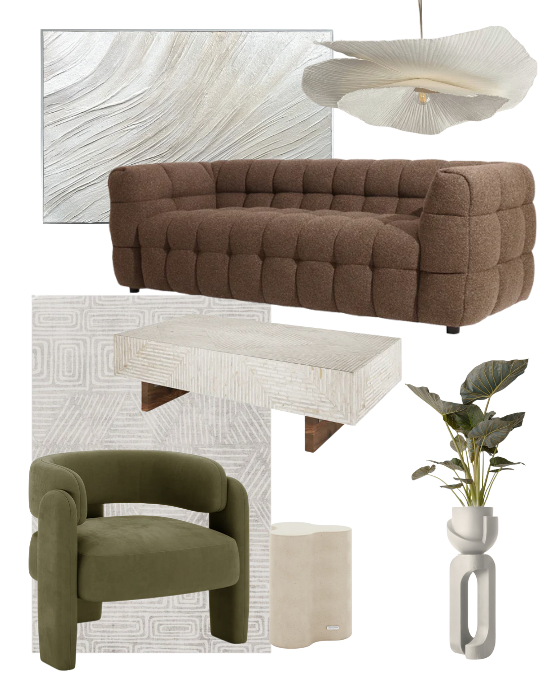 earthy modern living room warm contemporary interiors sculptural sofa design textured coffee table neutral living room styling olive accent chair organic modern decor layered neutral palette modern living furniture