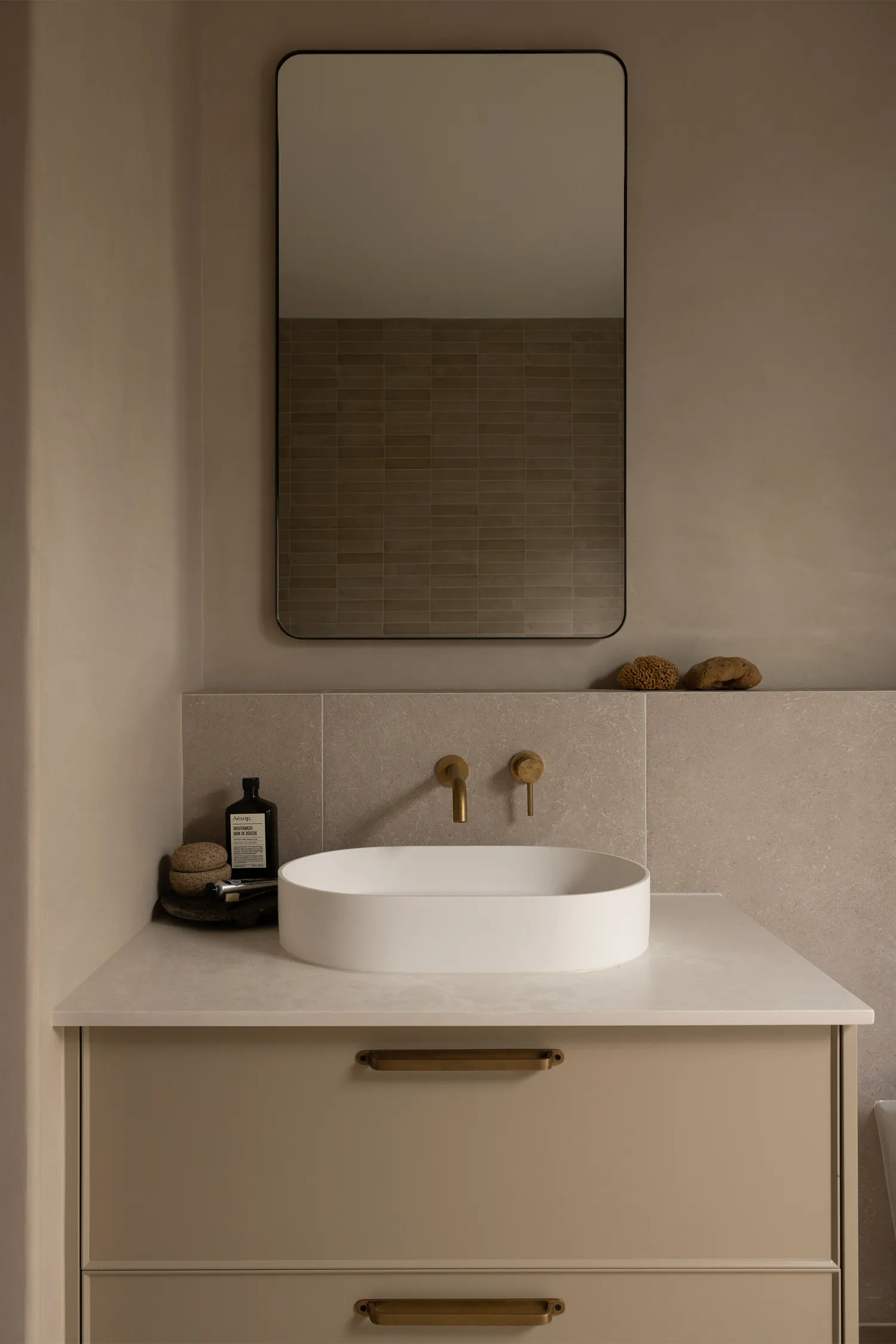 In the bathroom, the palette remains neutral and calming (exactly how you want the aura of a bathroom to be, especially with a bath as large as this!). The stone-look freestanding bath becomes the statement of the room, framed by soft beige walls that enhance the sense of serenity. Bronze ABI tapware and slim bronze towel rails introduce warmth and cohesion, tying back to the finishes used throughout the home. A white oval bowl sink, rectangular mirror and beige vanity keep the look clean and timeless, while brown kit kat tiles in the shower add texture and visual interest without overpowering the space.