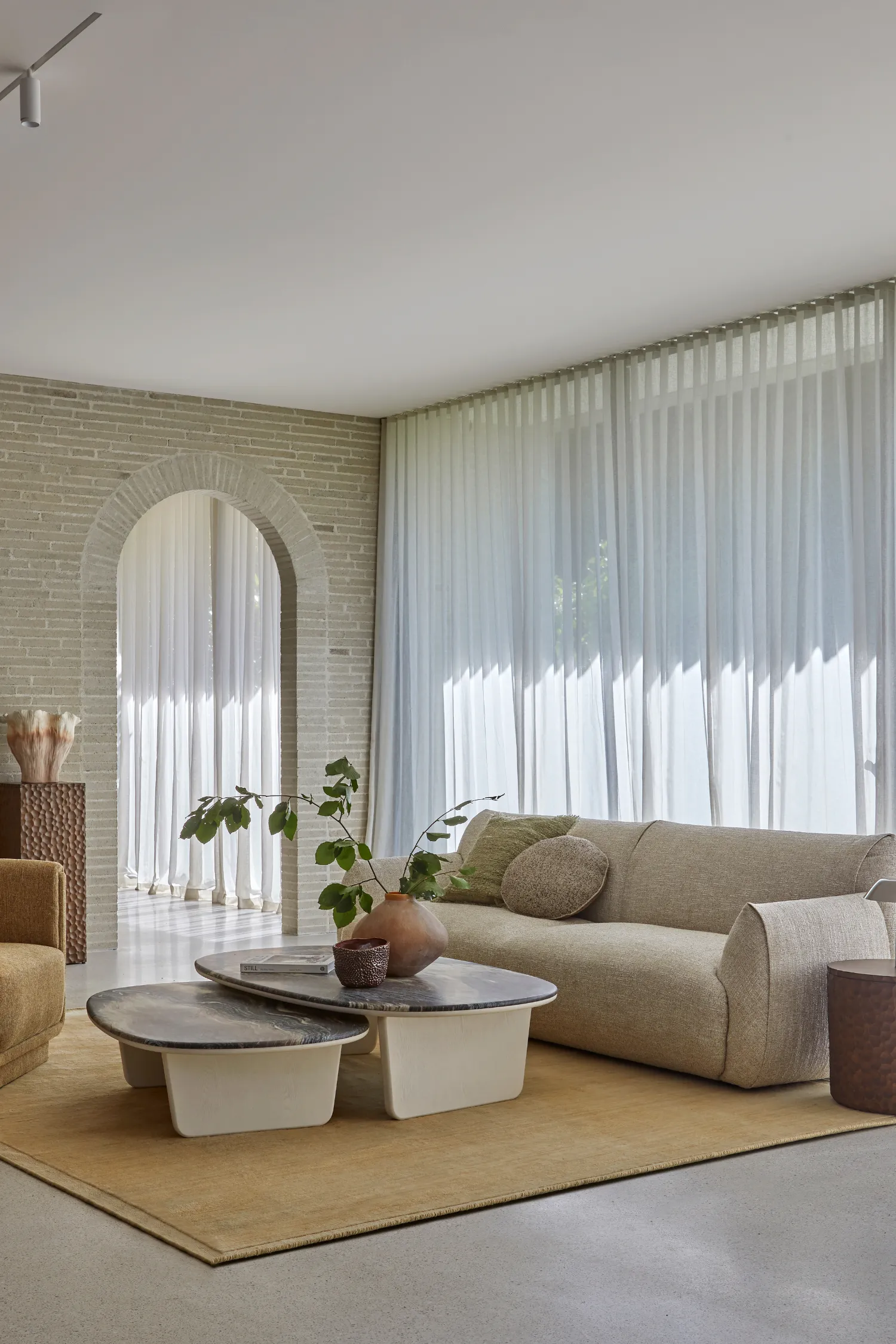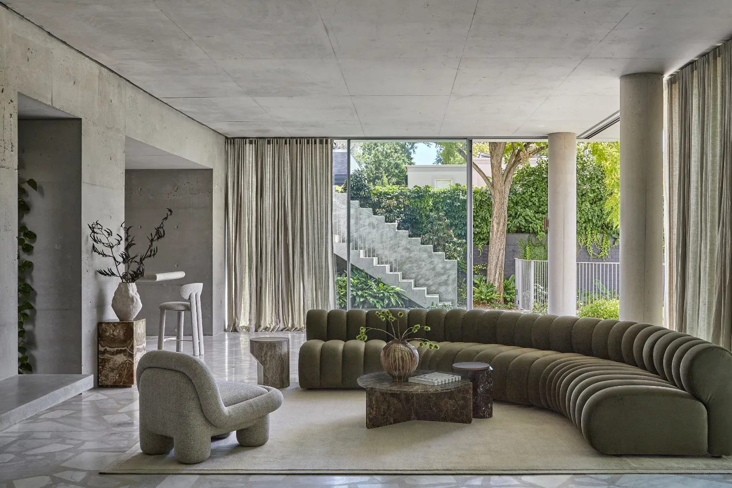 Mood board inspiration: Embrace curved profiles to soften architectural spaces. Pair sculptural sofas and chairs with organic rugs, rounded coffee tables and tonal cushions to create an interior that feels cohesive and retreat-like.