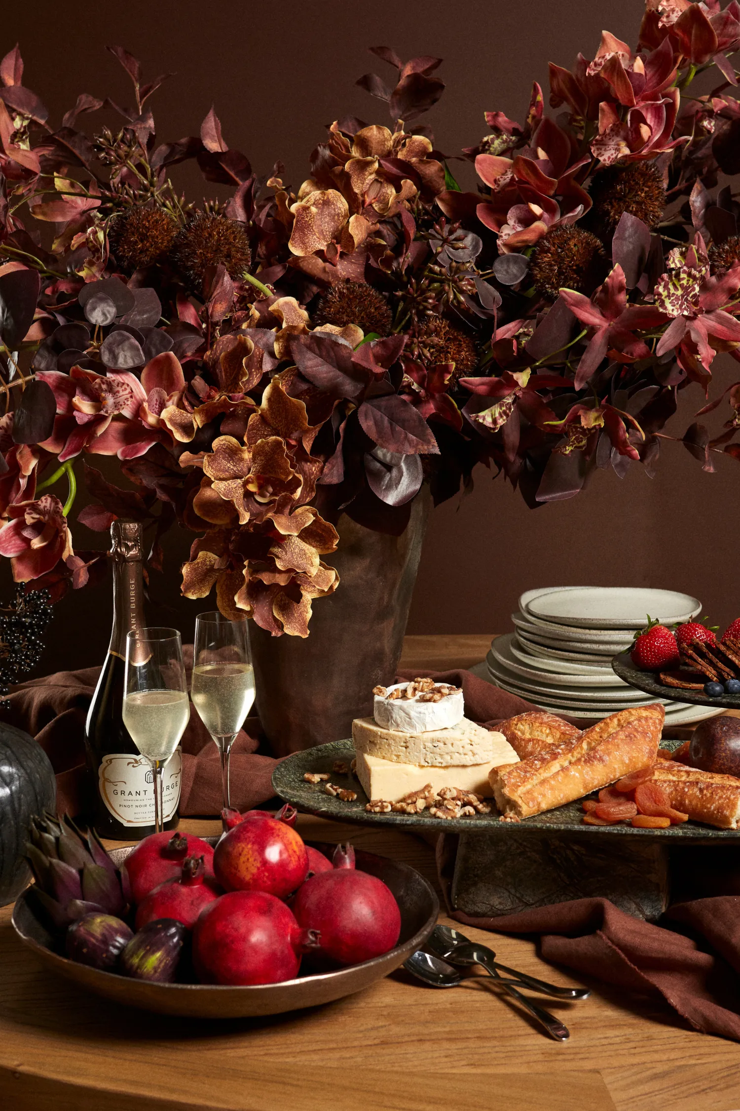 This season, we’re loving the shift towards deeper, moodier tones. Think burgundy maple leaf sprays, soft berry hues and earthy greens that instantly add warmth. These tones pair beautifully with mid-tone timbers, brushed metals, and natural stone finishes, creating a palette that feels grounded yet elevated. Our personal favourite is pairing the Alba Vase Nickel with coral and burgundy flora, placed on the Alfred Toronto Marble and Acacia Wood Side Table. For a softer contrast, layer these richer hues with creamy neutrals and tactile fabrics to strike that perfect seasonal balance.