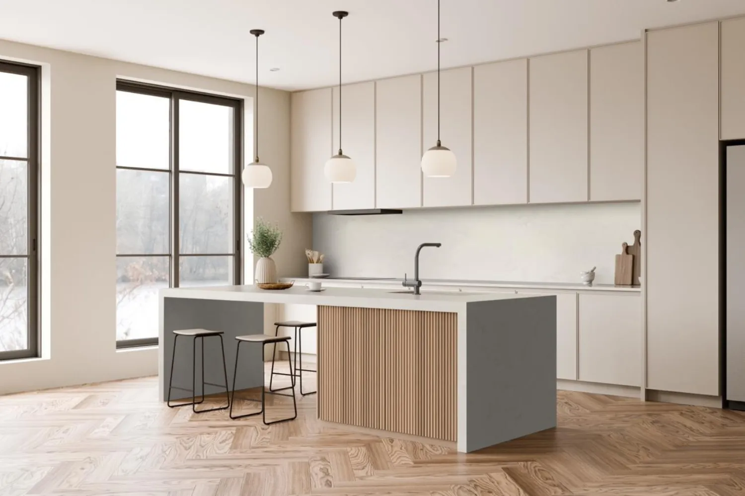 Aria Dusk inspires an interior blend of dark woods, black handles, pebble tones, and Organoid Tropical Heart, creating a cozy yet sophisticated ambiance.