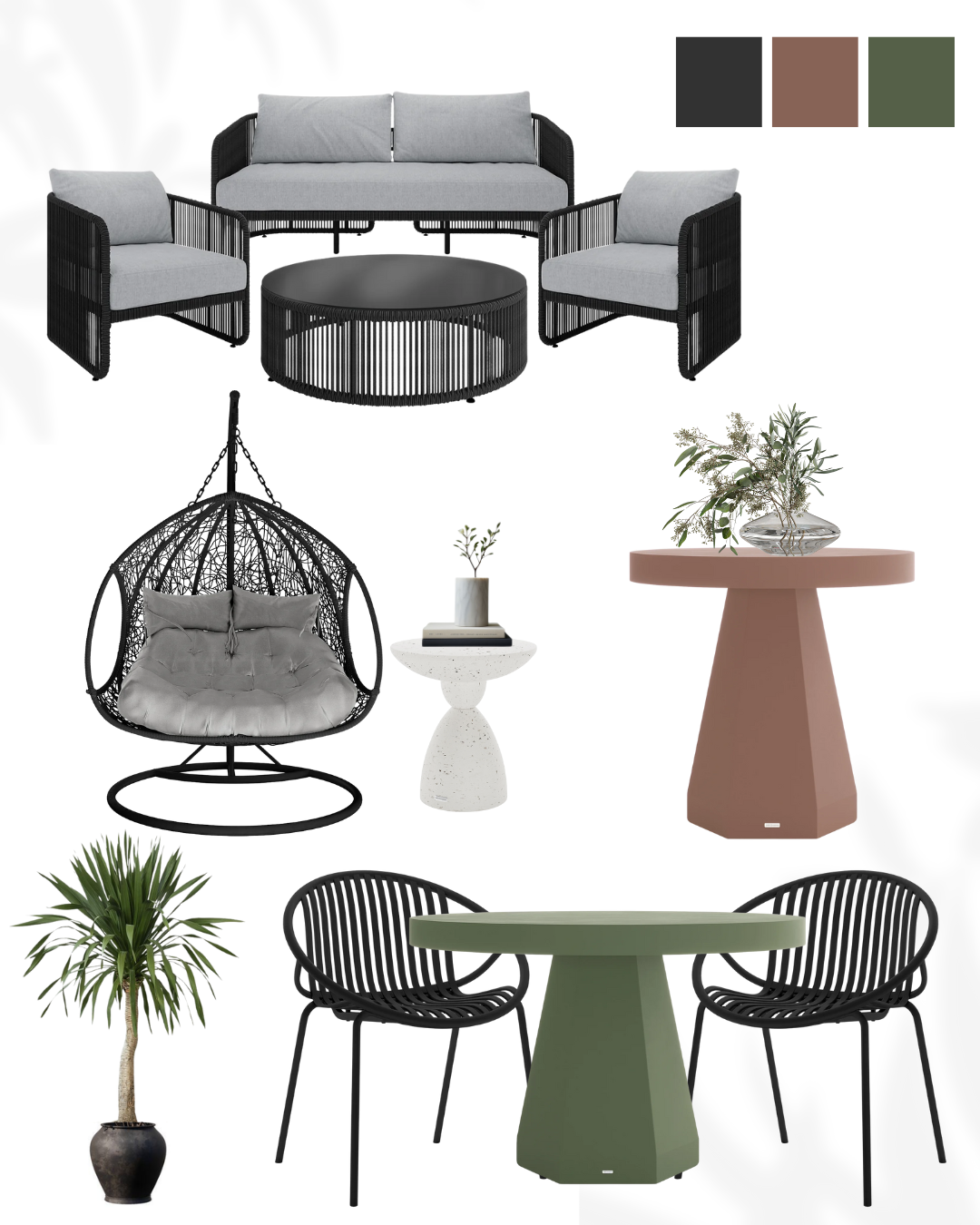 Outdoor furniture patio lounge alfresco dining black rope furniture terracotta side table sage green dining table egg chair contemporary exterior neutral palette textured upholstery
