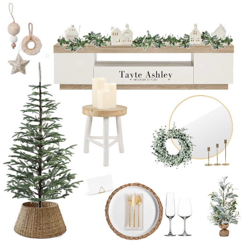 Neutral Christmas White Wood Ratan Gold Mirror candle sticks garland little houses candles brass brass cutlery dinner setting tree collar christmas tree christmas garland wreath christmas wreath tablescape