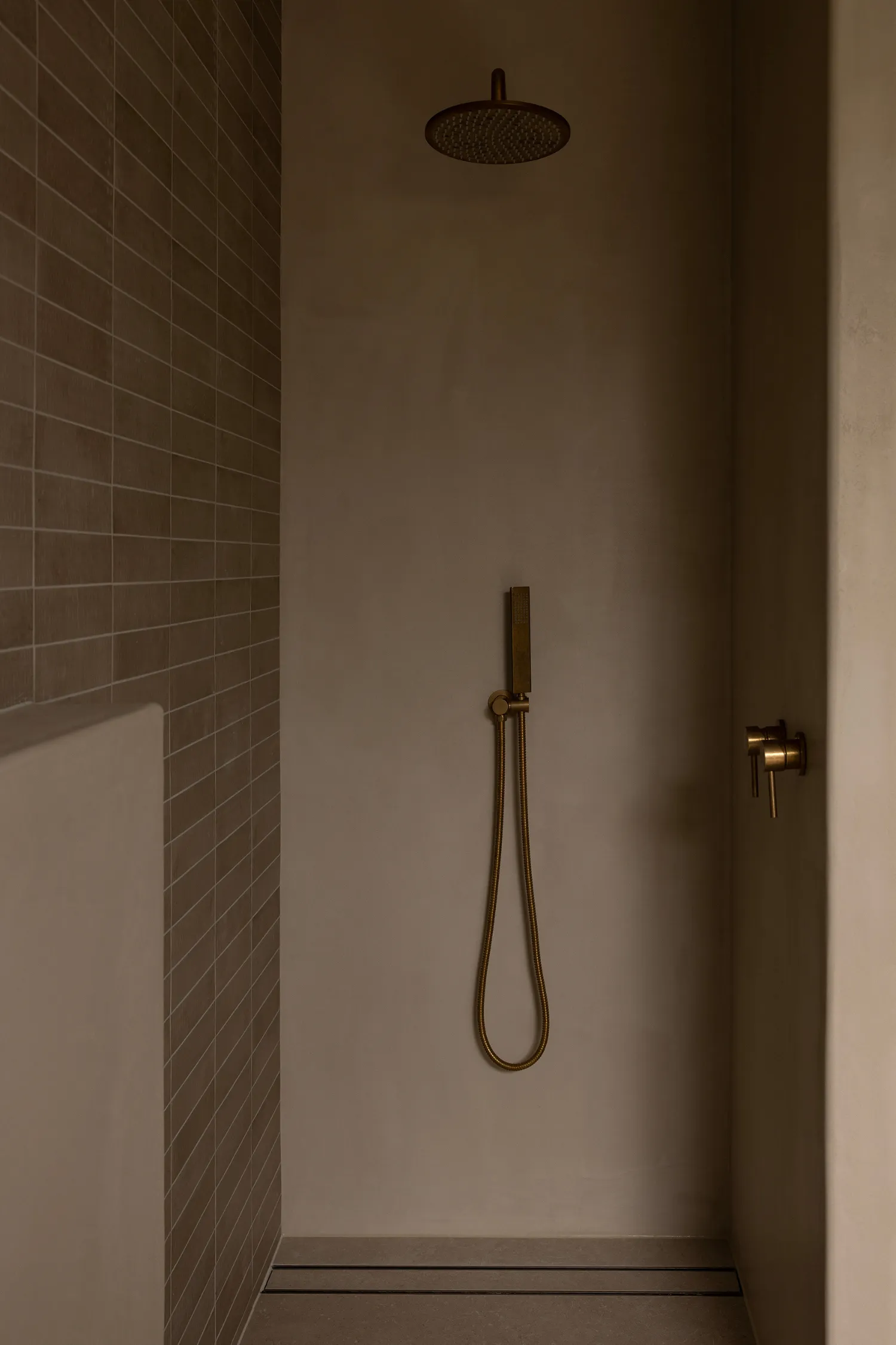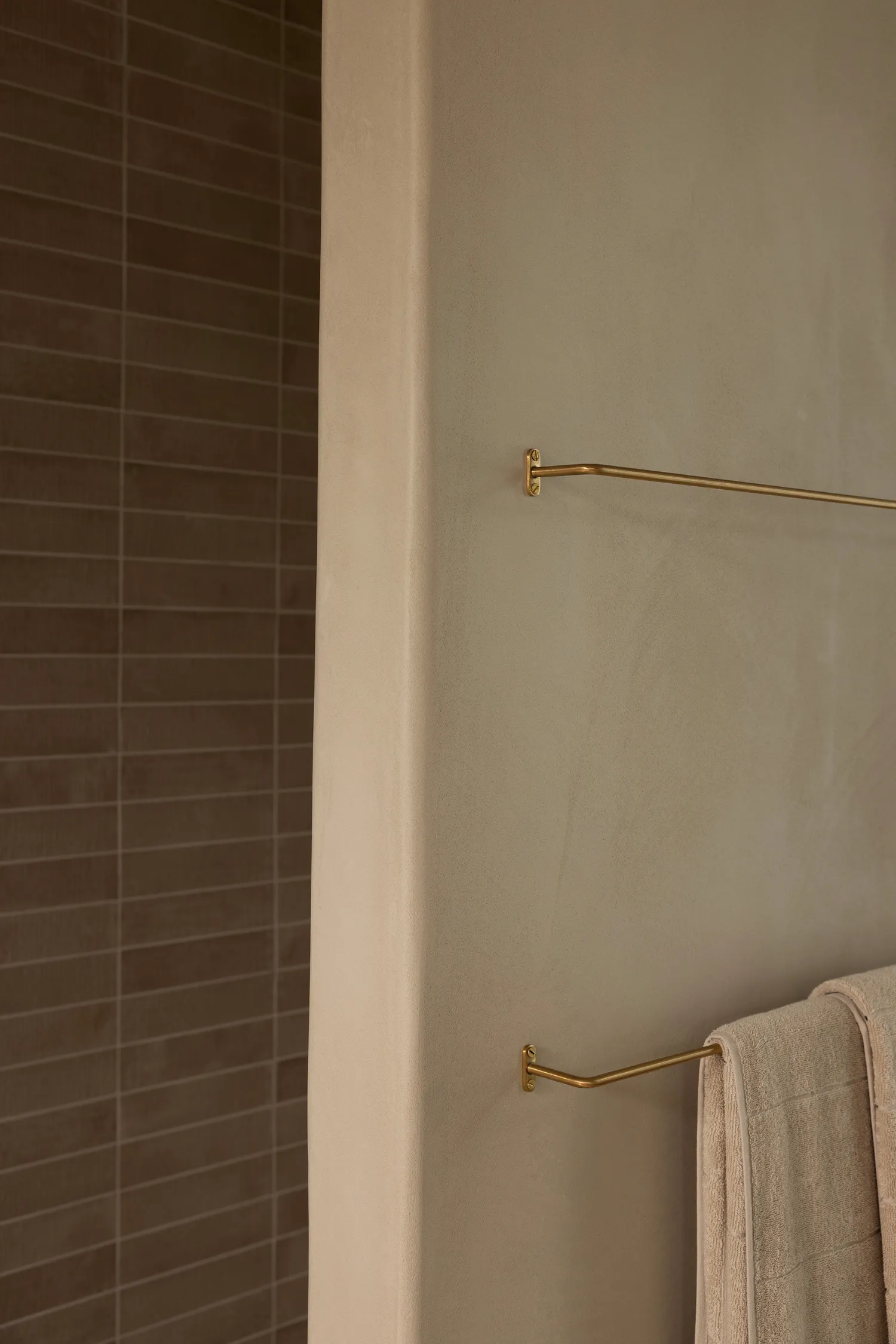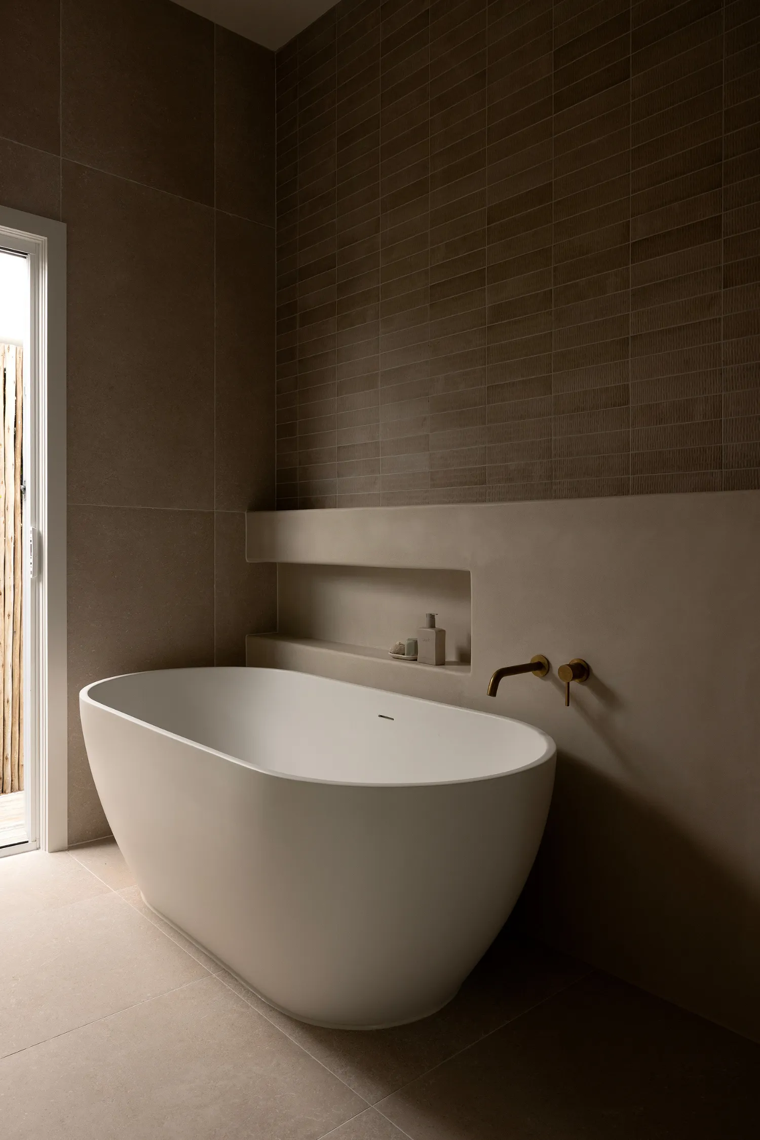In the bathroom, the palette remains neutral and calming (exactly how you want the aura of a bathroom to be, especially with a bath as large as this!). The stone-look freestanding bath becomes the statement of the room, framed by soft beige walls that enhance the sense of serenity. Bronze ABI tapware and slim bronze towel rails introduce warmth and cohesion, tying back to the finishes used throughout the home. A white oval bowl sink, rectangular mirror and beige vanity keep the look clean and timeless, while brown kit kat tiles in the shower add texture and visual interest without overpowering the space.