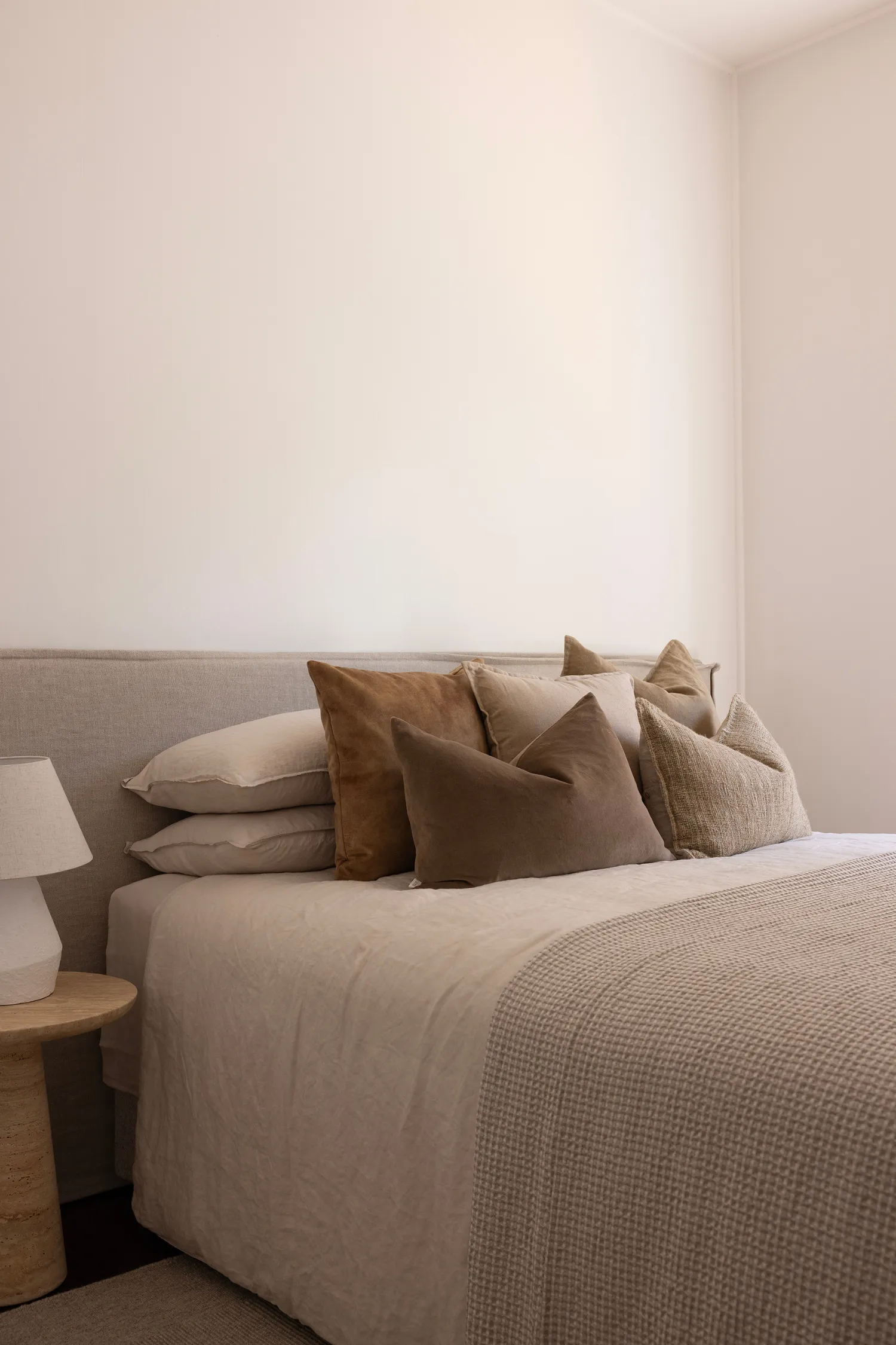 In the bedroom, comfort is what you feel just by looking at the room (just like the living room!). Dark timber floors contrast beautifully with beige wardrobes finished to match the bathroom cabinetry, complete with slim bronze handles for continuity. Crisp linen bedding is layered with a wool throw and brown cushions, creating a cosy, hotel-like feel. A simple white bedside lamp completes the space, reinforcing the home’s calm, restorative energy.