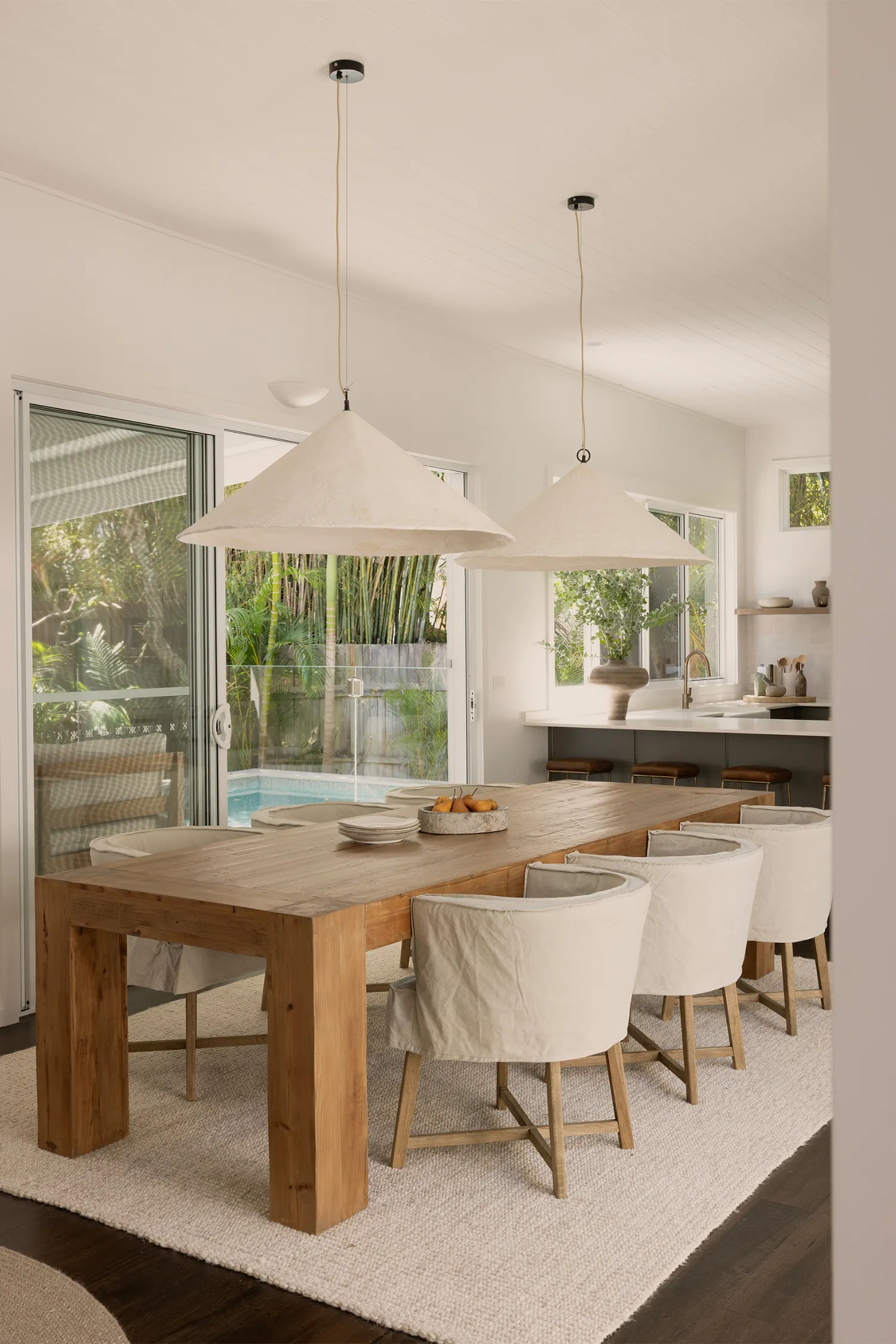 Flowing seamlessly into the dining area, dark timber continues to create a cosy, homely feel. A solid wood dining table sits beneath sculptural cone pendant lights, creating a warm, intimate setting for conversations and evening dinners (that’s what you first imagine when you first look at the dining area!). Curved cream dining chairs soften the look, while a plush cream rug adds comfort and balance, ensuring the space feels both styled and liveable.
