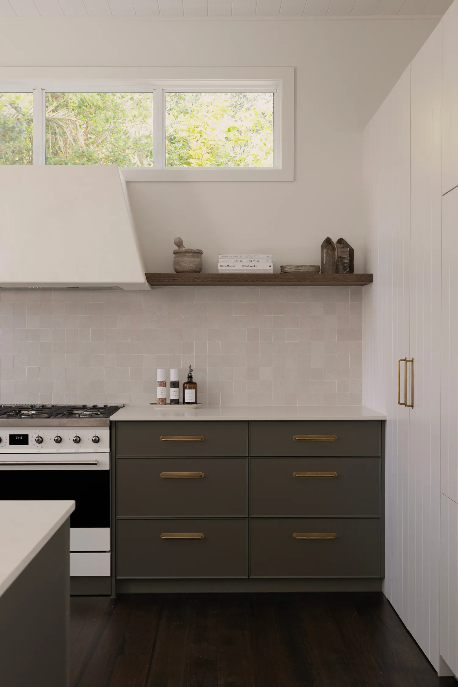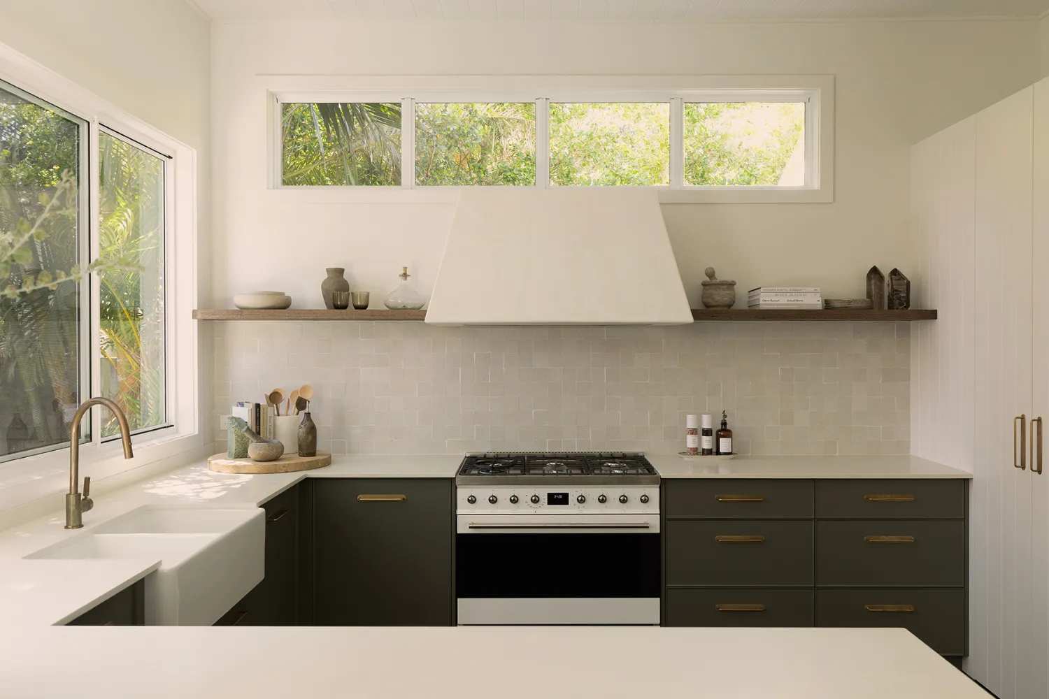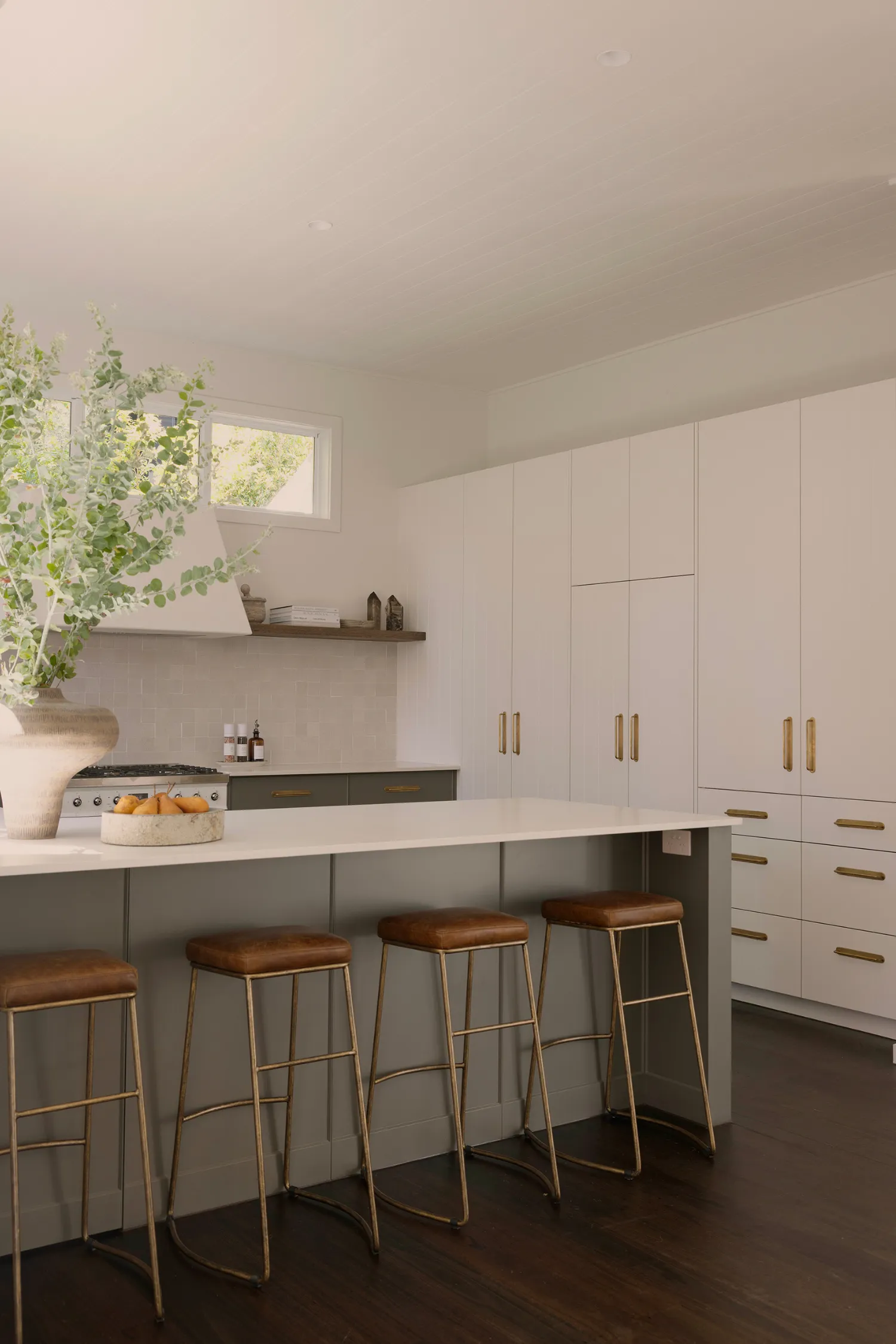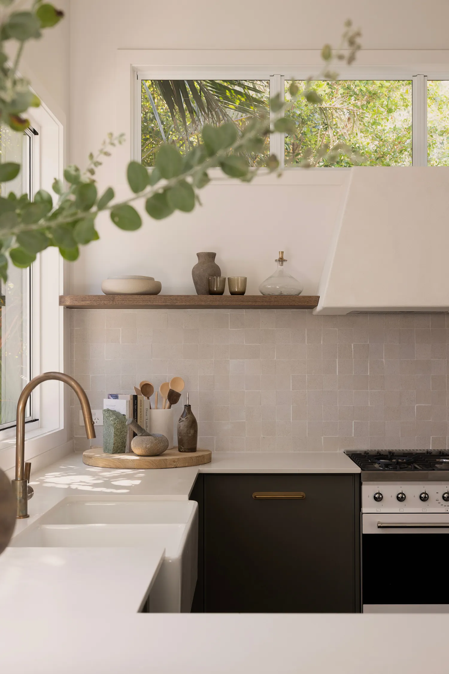 The kitchen sets the tone for the rest of the home, with a relaxed neutral palette that continues through each room. Crisp white cabinetry is paired with dark timber flooring, creating contrast and warmth underfoot. Bronze handles add a subtle metallic accent, echoed beautifully in the bronze gooseneck tapware. Brown leather bar stools with elegant gold legs introduce a touch of understated luxury, while small square beige stone-look tiles on the walls provide texture and a softly coastal feel. Open timber shelving styled with greenery brings the outdoors in, which feels like an essential ingredient for Byron homes.