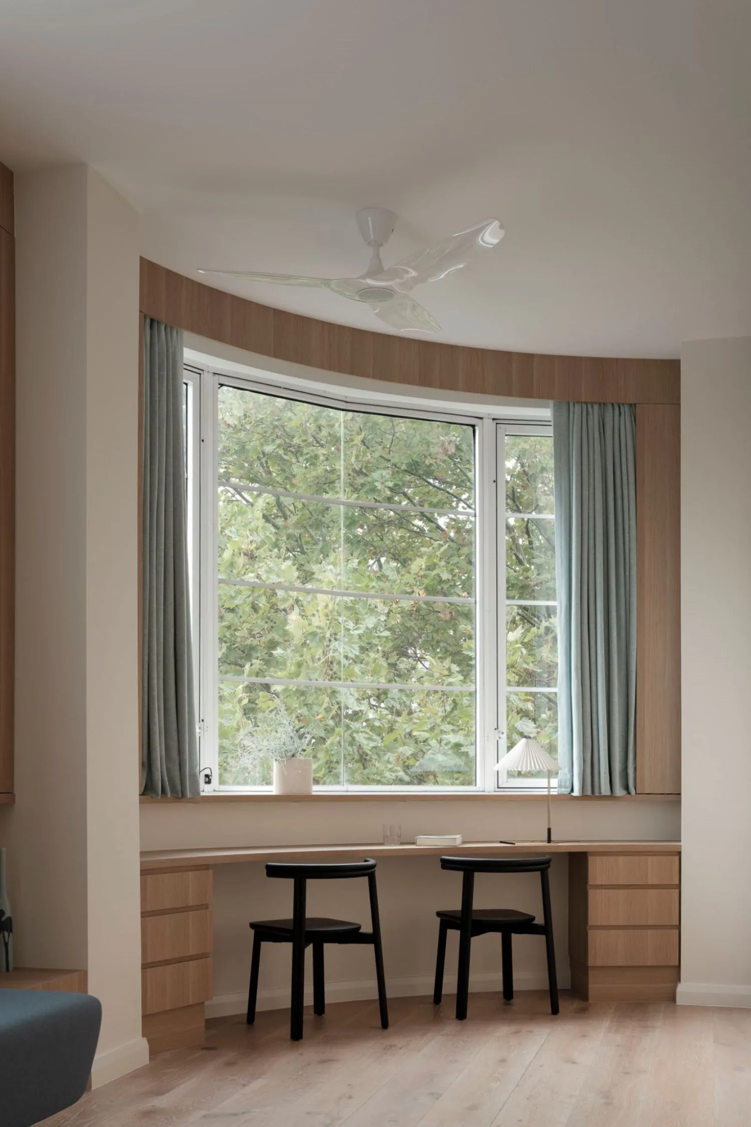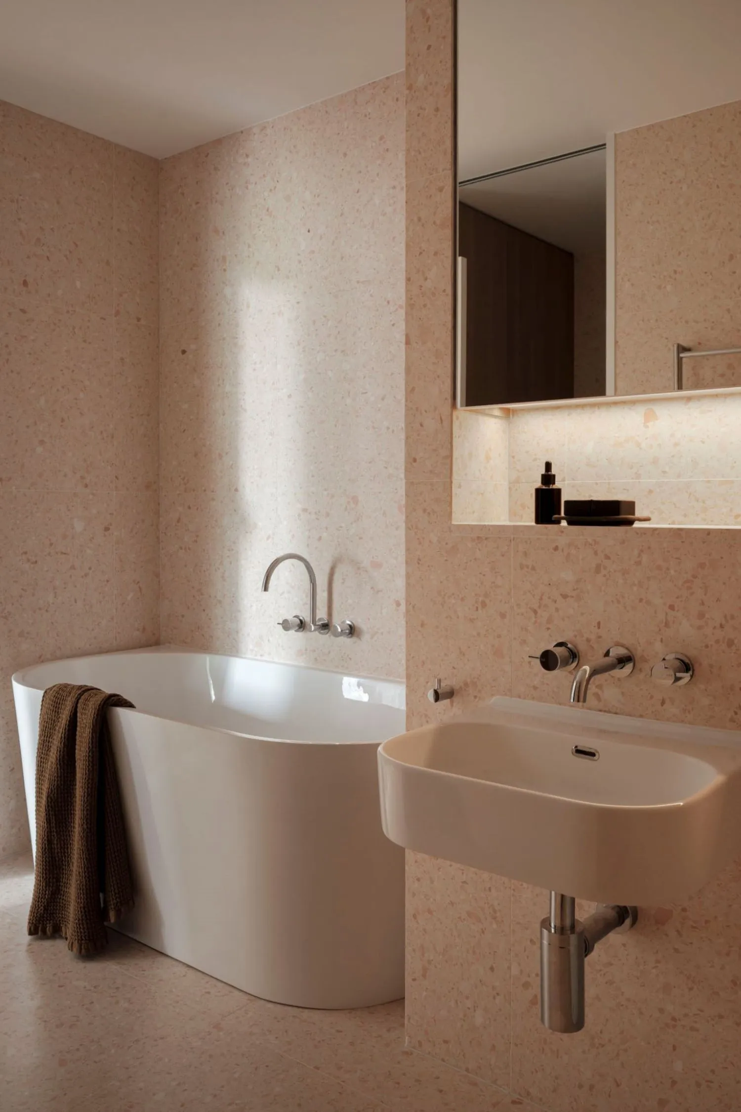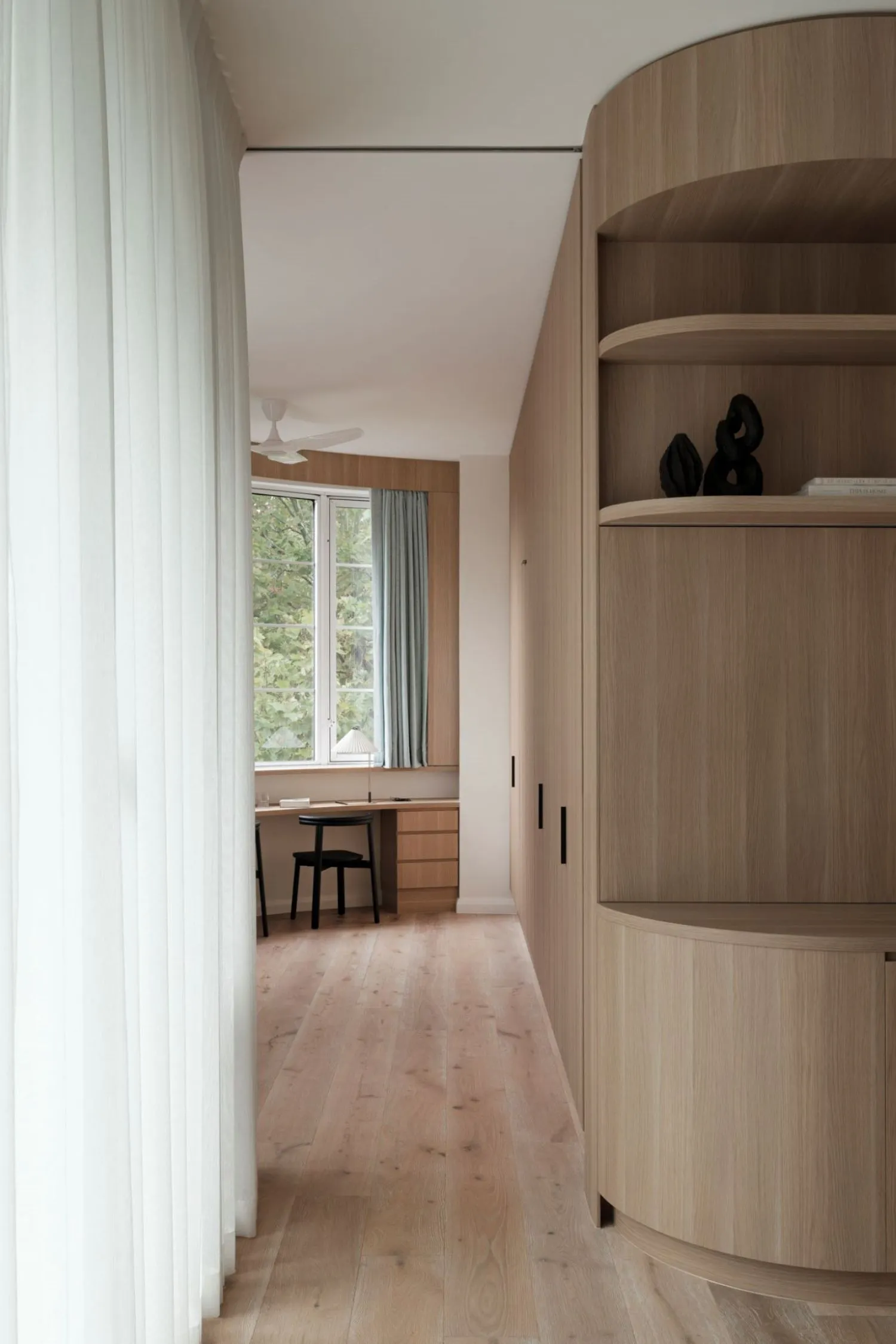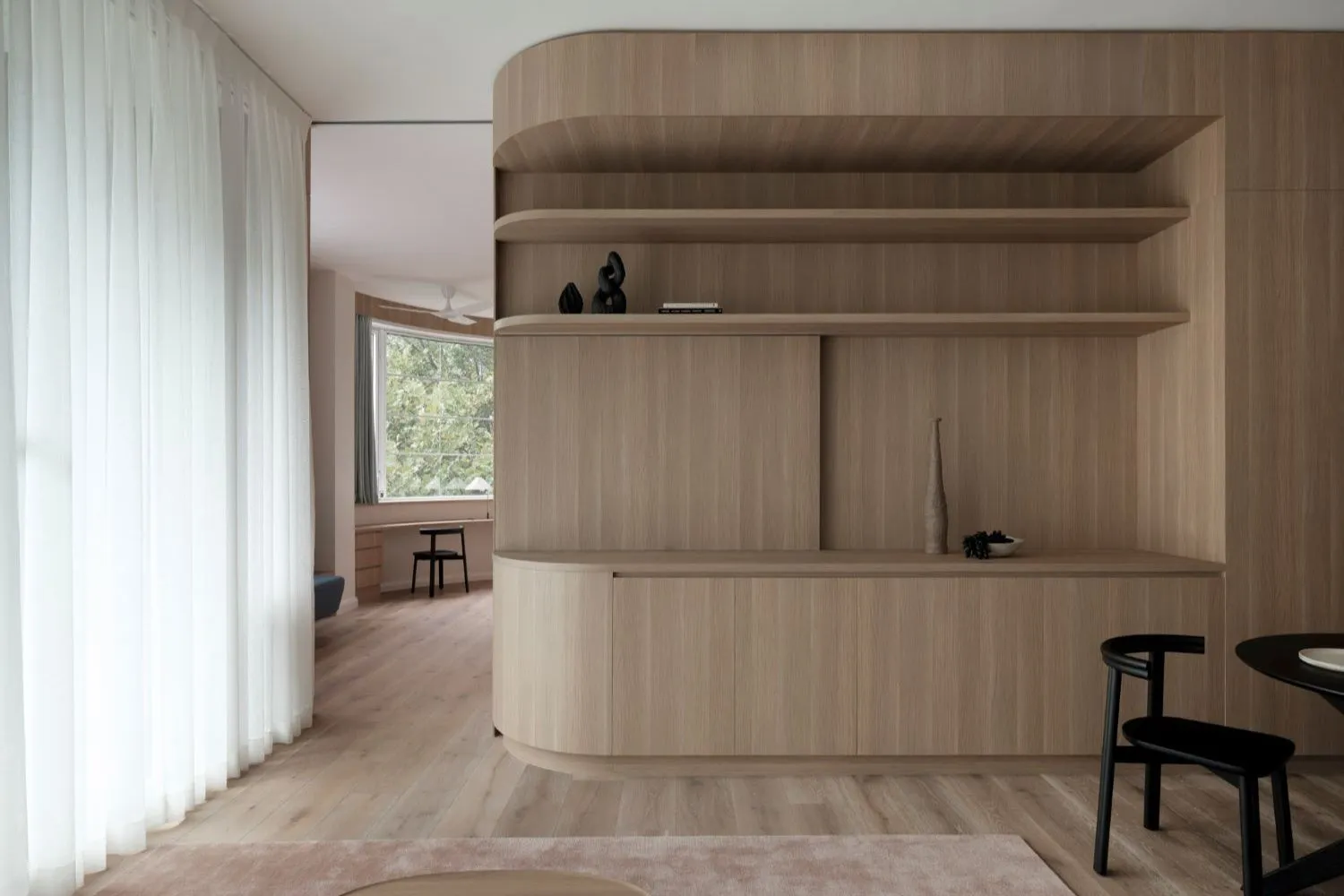 Speaking of joinery, even this element has been optimised, both aesthetically and functionally, to contribute to the client's goals. For example, the TV can be hidden behind a sliding panel to help create a cohesive space and an organic atmosphere. The joinery was also designed to wrap around the perimeter of the room, enhancing the connection between each space.