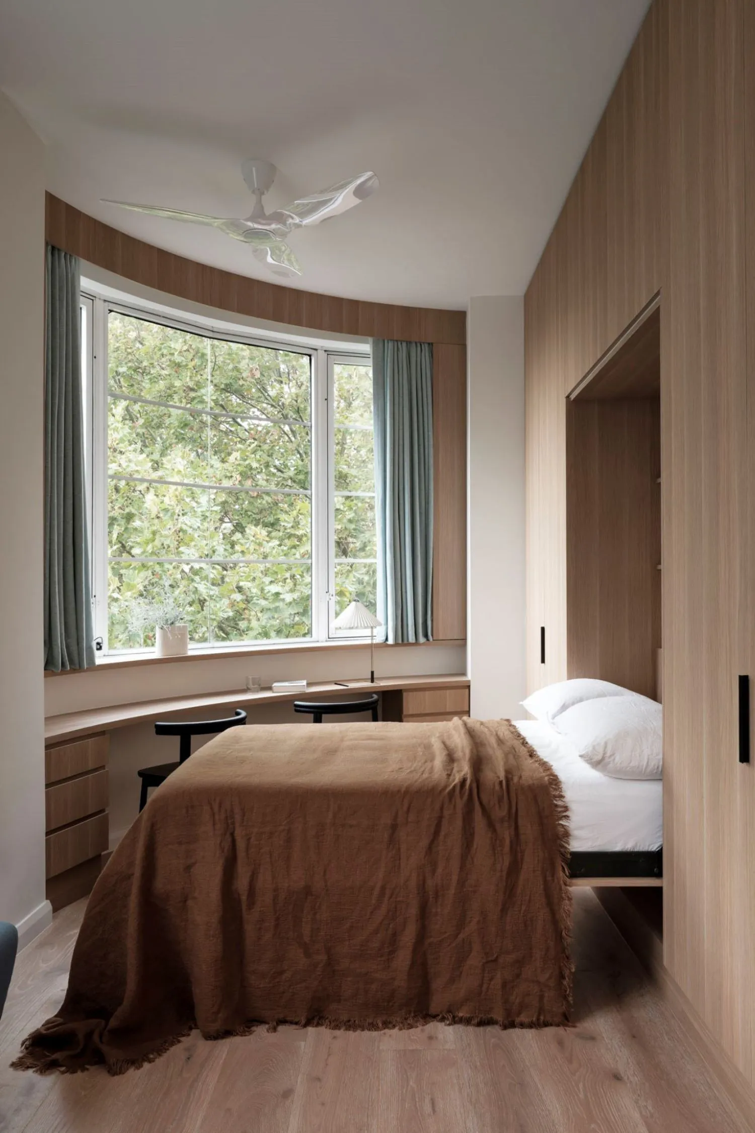 This concept really shines within the second bedroom, which, with the help of a concealed sliding door, has been designed to flow with the entire apartment while providing the clients with both an office and a guest bedroom. This versatile space was achieved through the incorporation of inbuilt features. A bench seat was added for when the space was utilised as an extension of the living room, an inbuilt desk has been installed to create a seamless working space, and a drop-down bed sits within the joinery. Impressive, right?