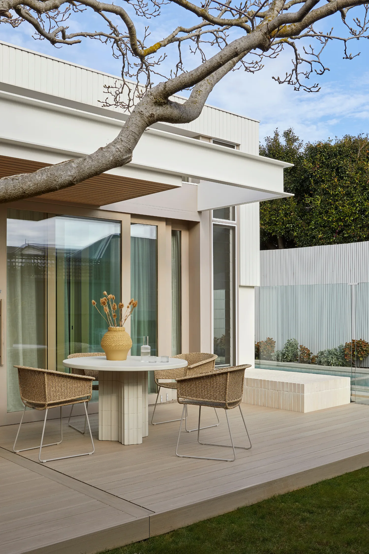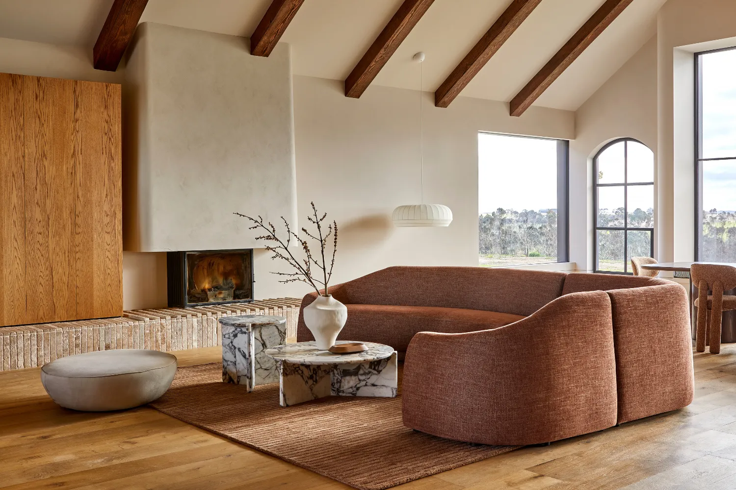 Outdoors, comfort takes centre stage, with upholstered lounge pieces that have generous proportions, plinth-style bases, and soft curves that reimagine the alfresco experience. Earthy tones of ginger, olive, and sienna allow each piece to blend seamlessly into the landscape, while stripe detailing and woven textures bring just enough visual intrigue. It’s an invitation to slow down, lean back, and let the outside in.