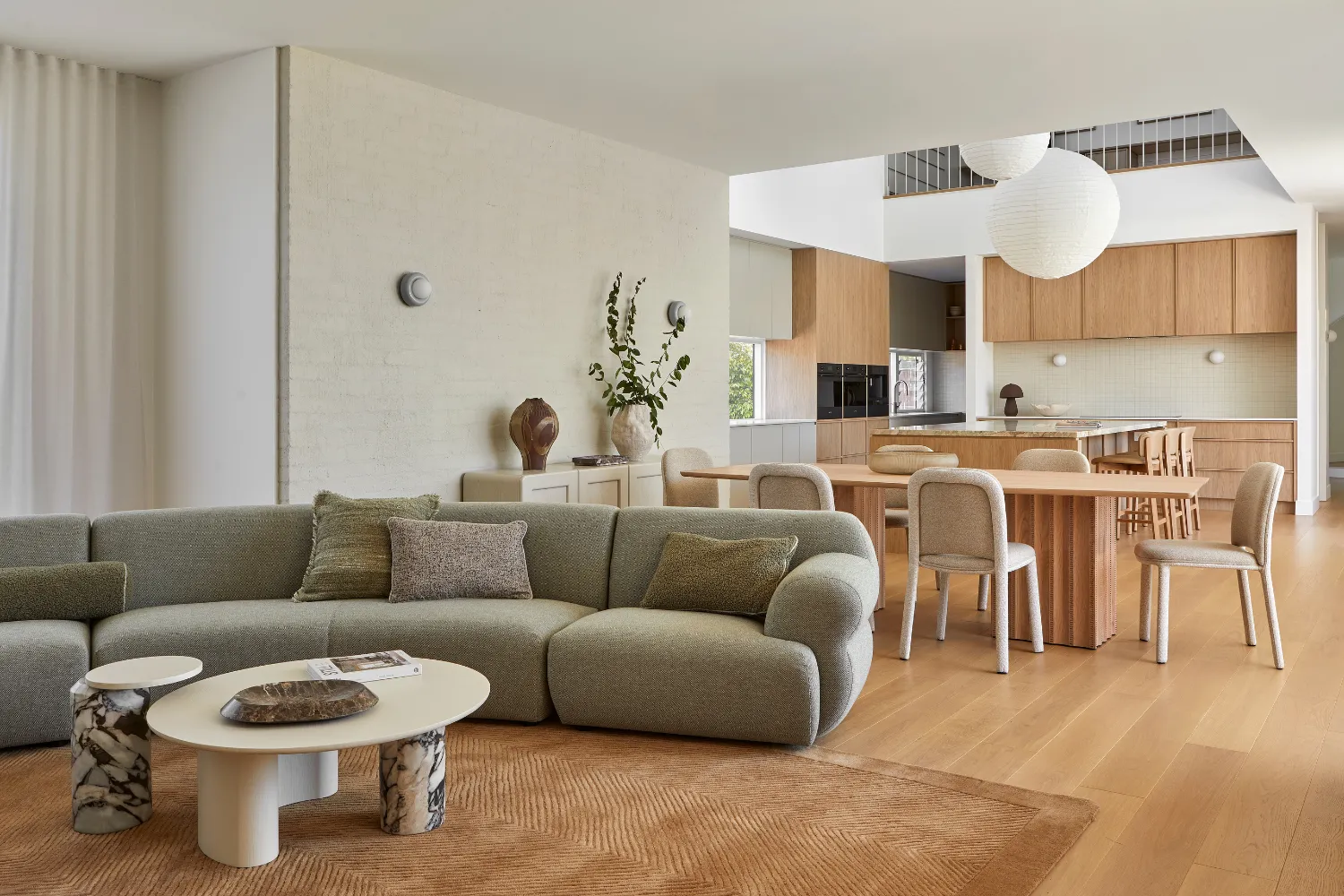 Mood board inspiration: Embrace curved profiles to soften architectural spaces. Pair sculptural sofas and chairs with organic rugs, rounded coffee tables and tonal cushions to create an interior that feels cohesive and retreat-like.
