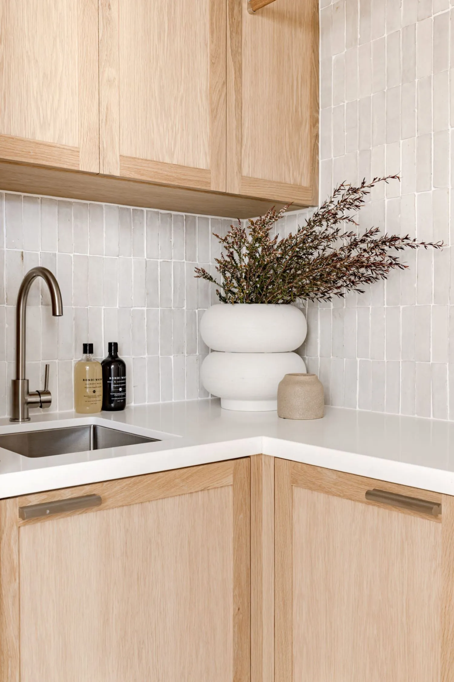 Like most pieces within your home, the colour of your cabinetry will make a world of difference within your laundry. We recommend opting for something subtle, like oak or a bright white, that still feels cohesive with the rest of your home. This way, your laundry cabinetry won’t feel overwhelming, and it allows you to be creative in other areas, such as your tiles or tapware.