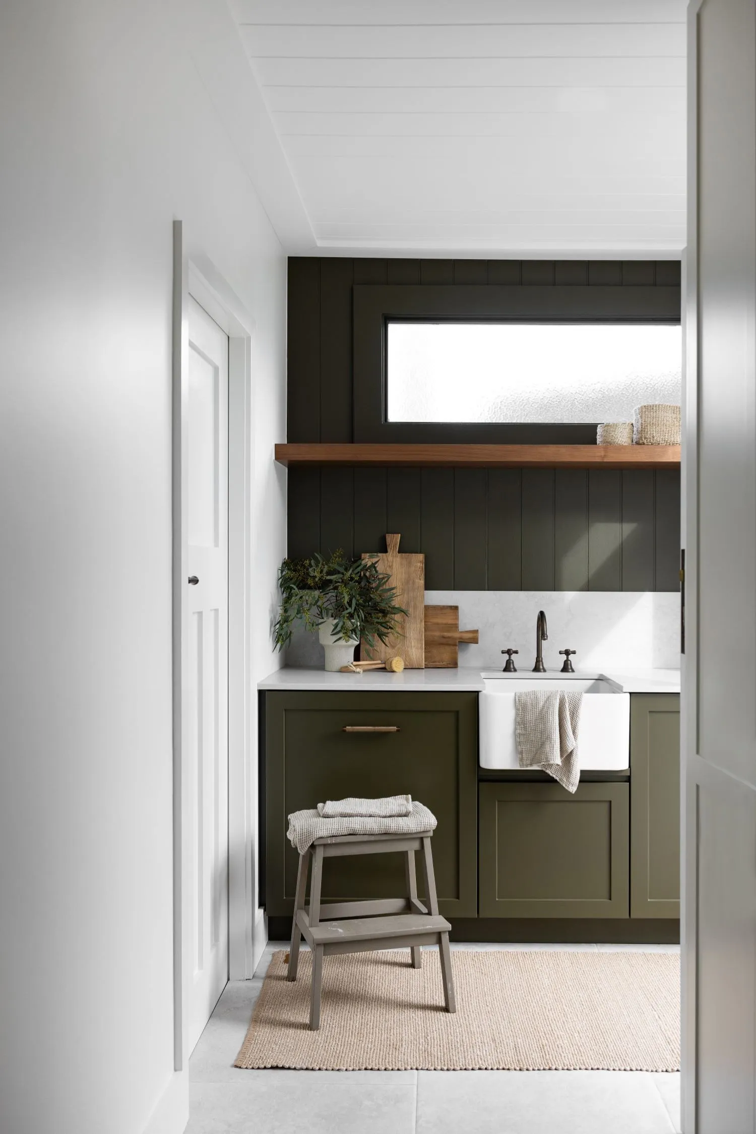 VJ (Vertical Joint) paneling is a popular choice for creating a timeless, coastal-inspired splashback in the laundry. Its grooved, vertical lines add subtle texture and a classic touch, giving the laundry a relaxed, airy feel. Painted in white or soft neutrals, it can help brighten up the space, while deeper colours like navy or sage add a touch of elegance. VJ paneling is also durable and easy to clean, making it both a practical and stylish choice for a hardworking area like the laundry.