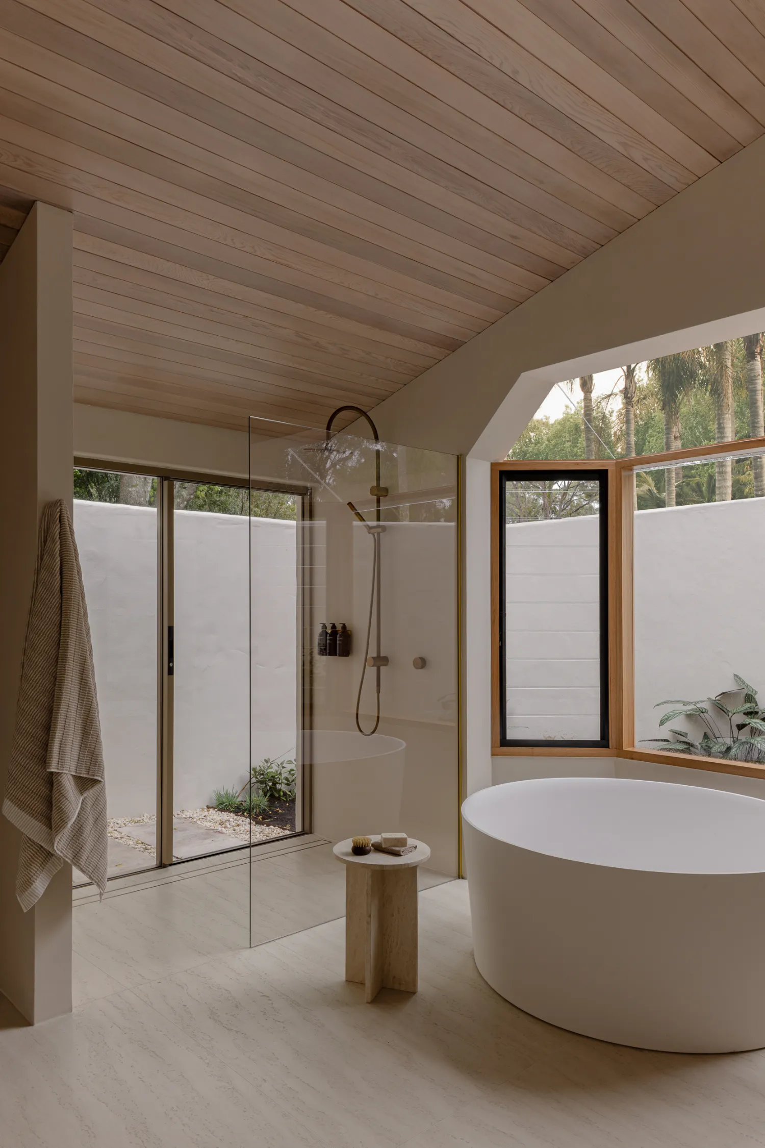 In the bathrooms, you can’t help but be drawn to the smooth stone basins and soft neutral tiles, alongside the brushed brass tapware that gleams subtly against the muted backdrop. Not to mention the bath of dreams! It’s the kind of space that feels like a true sanctuary within the home, perfect to relax following long days by the sparkling pool and lingering, sunlit evenings.