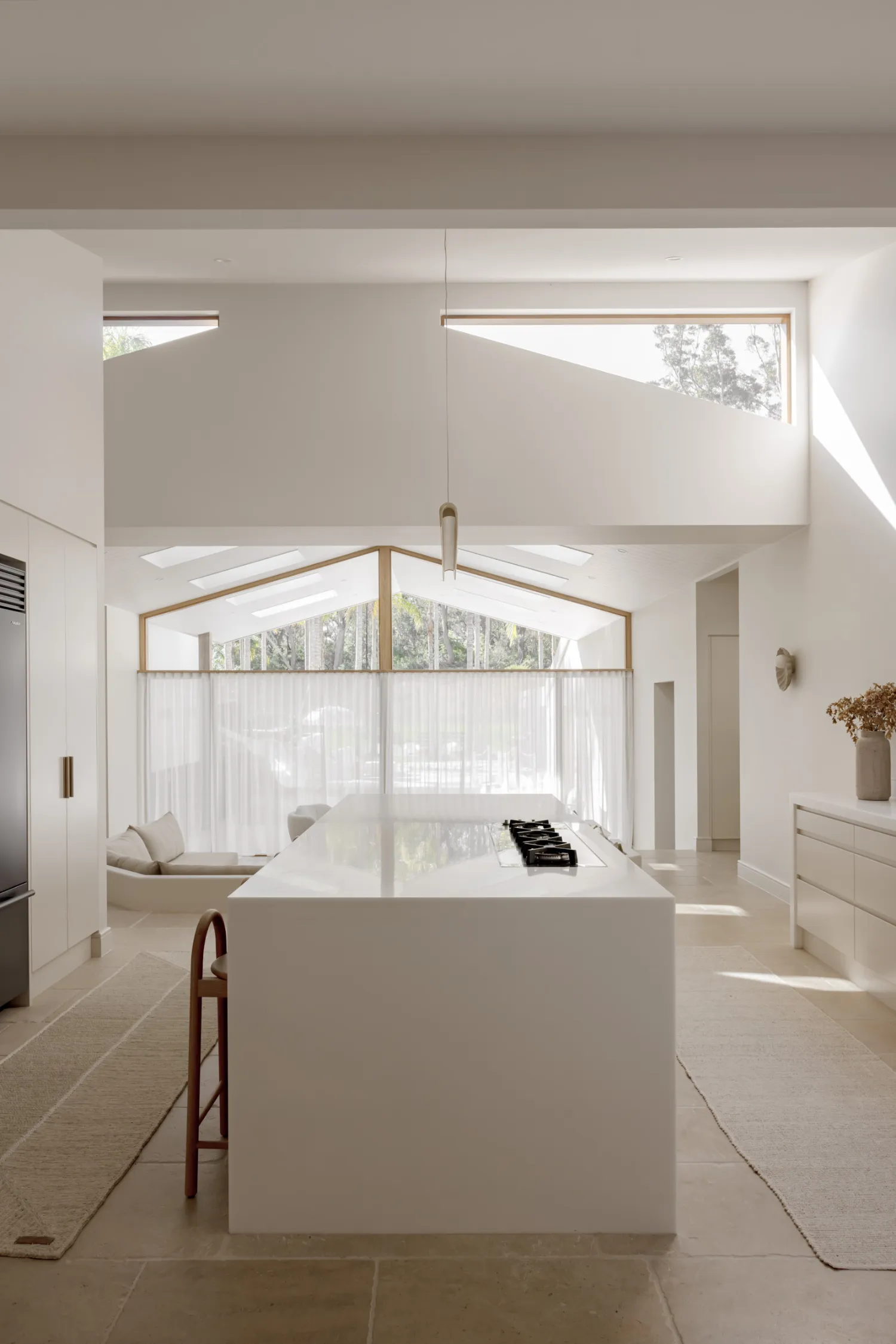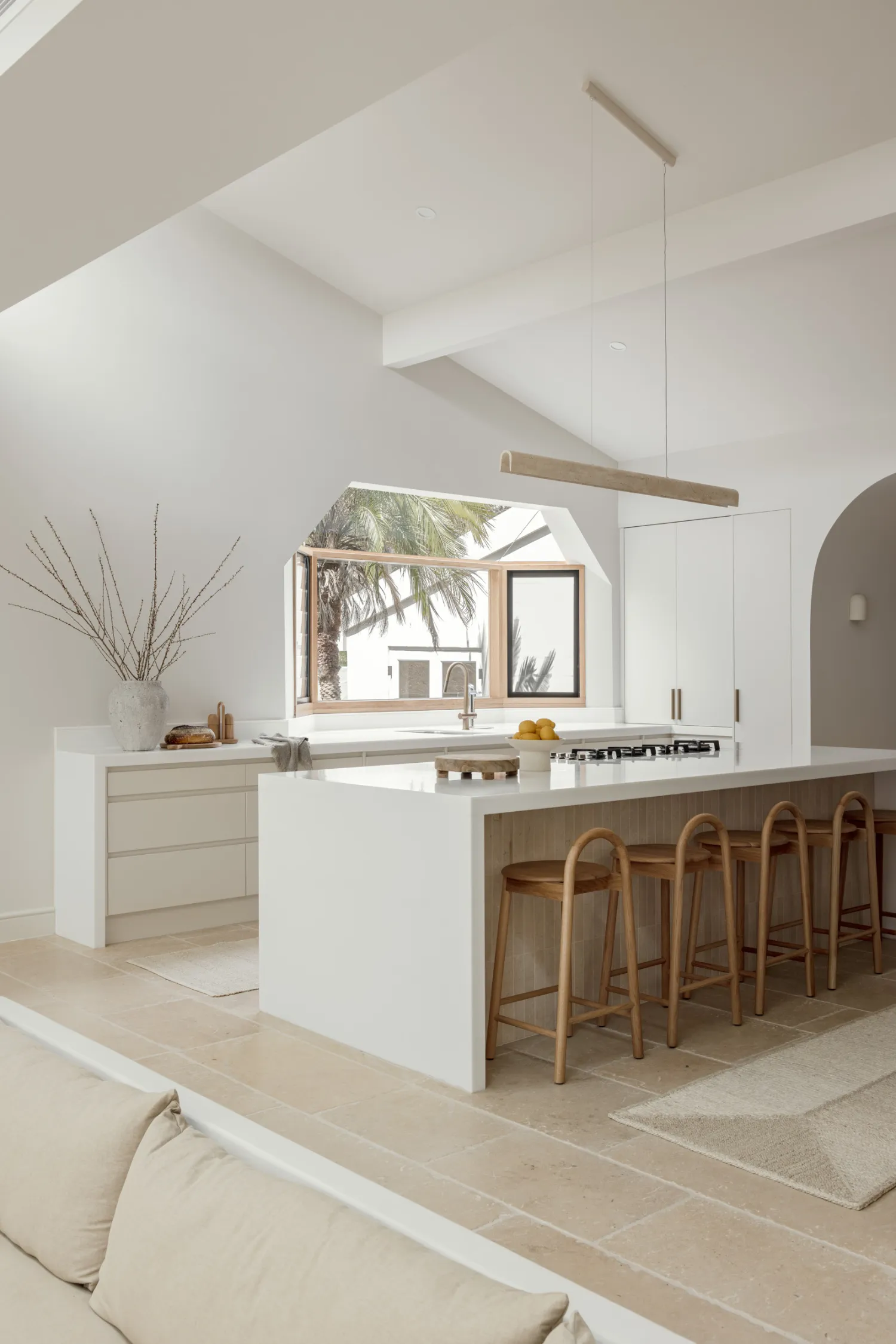 At the heart of the home, the kitchen and dining areas become a true statement. The island anchors the space, balanced by textured cabinetry and soft, curved archways that echo throughout the house. It’s a kitchen designed for connection, hosting sunlit evenings, the kind where you bathe in the glow of soft, golden light. To complement the colours and textures, the tiling underfoot gives the space a grounding tactility, while brass fixtures add a gentle hint of luxury.