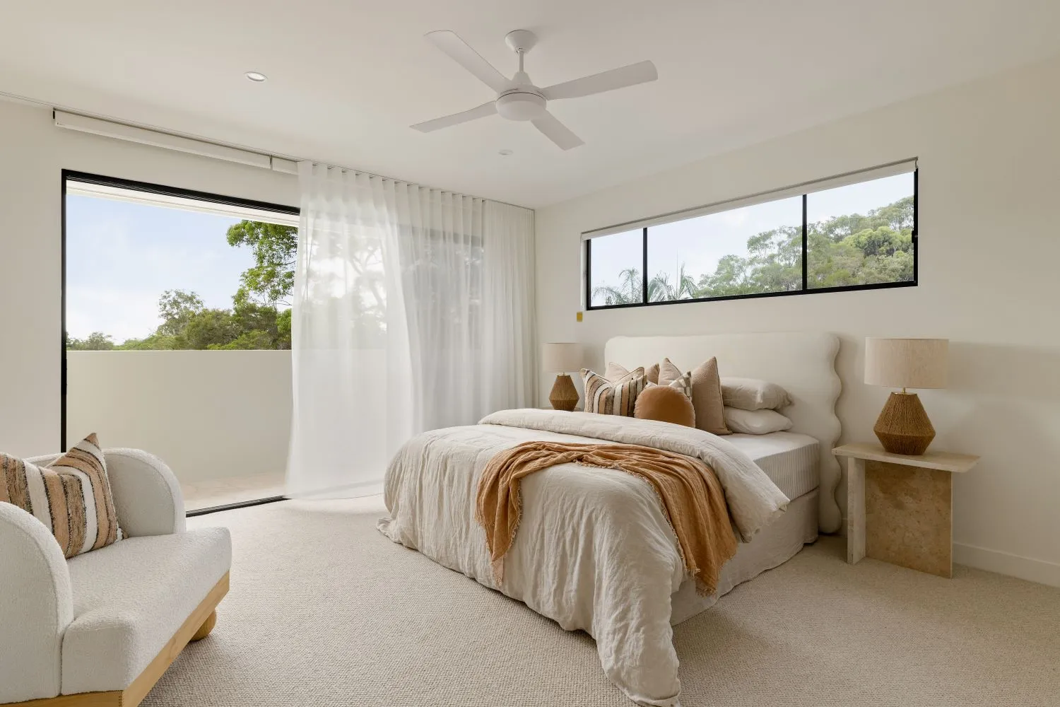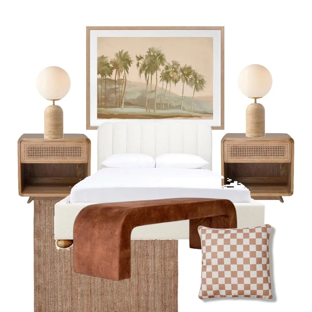Our advice? Opt for bedroom furniture, in a material that complements your interior design style. For example, a coastal-style bedroom might feature more timber bedside tables and bench seats, whereas a contemporary-style bedroom might focus more on boucle bedheads. Both still work to achieve the same goal, a tranquil bedroom.