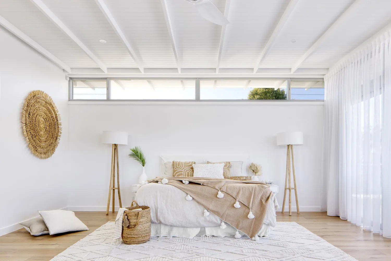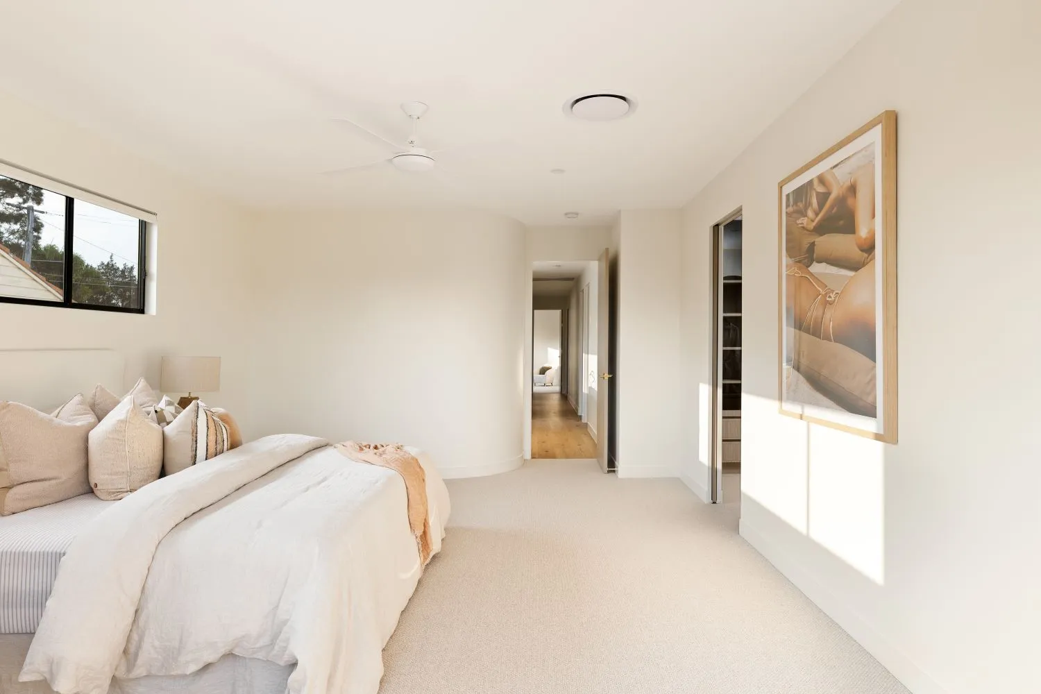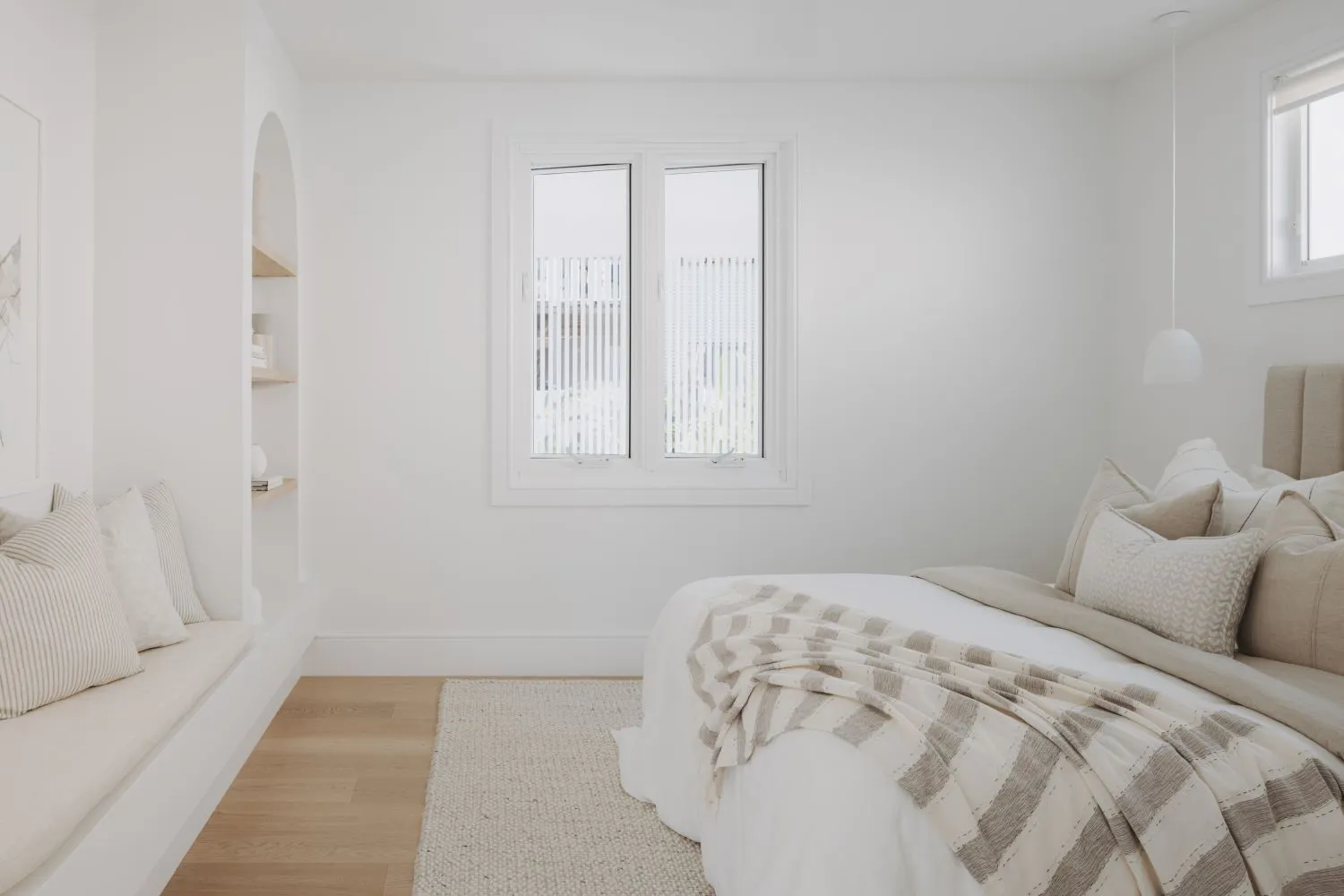 If you are looking to bring a bit of colour into your white bedroom, consider doing this with cushions, artwork and rugs. This will subtly add a pop of boldness, without overwhelming the space.