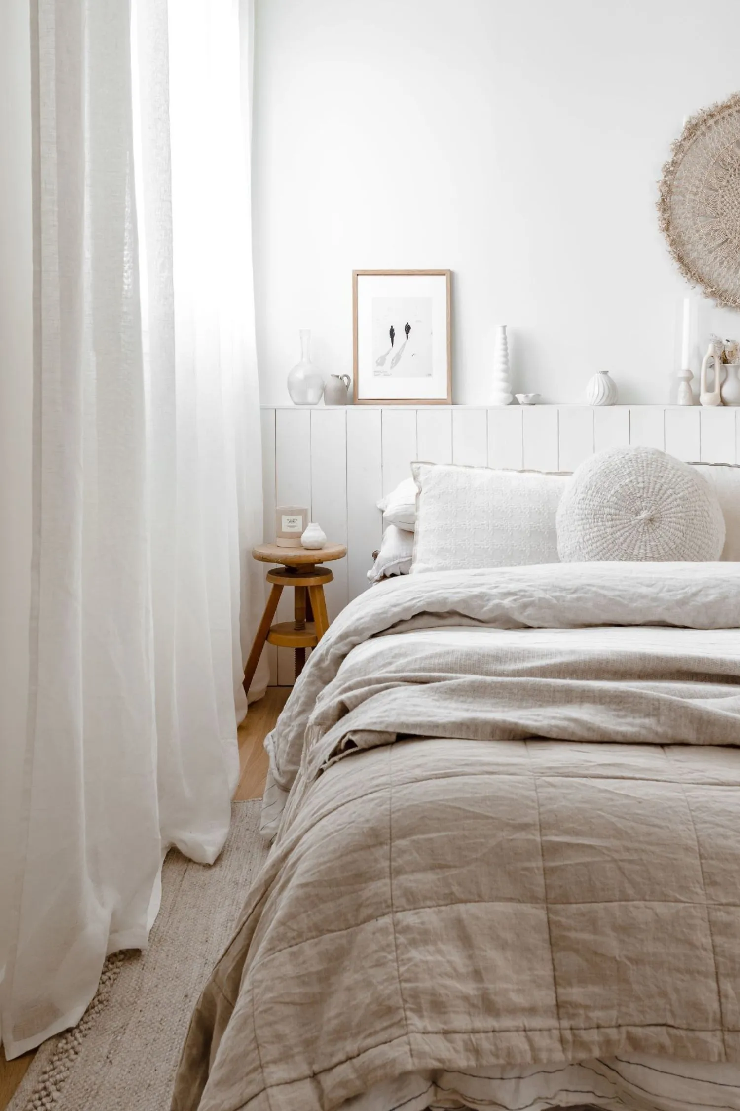 Artwork can completely enhance and elevate your bedroom, making it feel more inviting. White walls can sometimes feel a little plain, so opting for artwork can add to both the aesthetics and atmosphere. We love textured pieces that will create another layer of depth in your bedroom, without overpowering your palette.