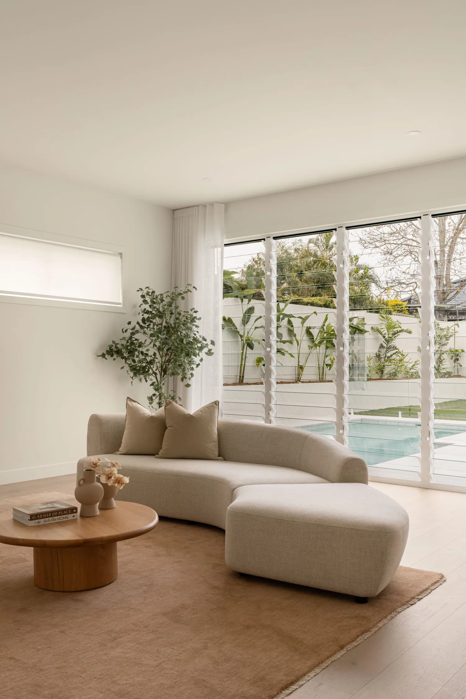 Introduce one grounding element like a timber coffee table, a neutral rug, a sculptural lamp